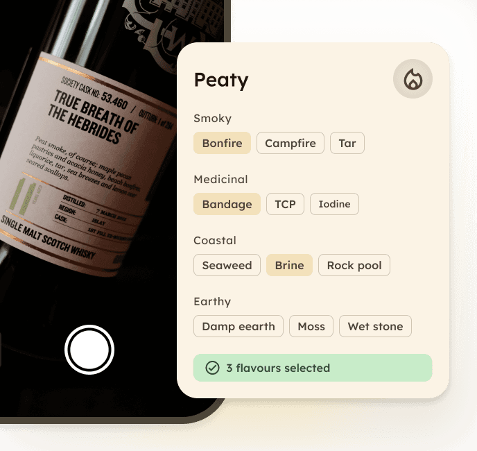 As your guests taste, they tap through flavours on the Dramfly flavour wheel. A full tasting note in seconds. It works offline, with one thumb, even after the third dram. The conversation with the brand ambassadors keeps flowing. No one is buried in their phone.